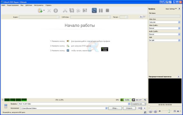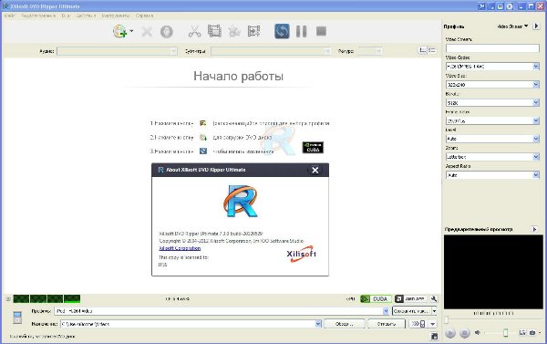 Современная программа Xilisoft DVD Ripper Ultimate, довольно мощная и с удобным интерфейсом, для копирования DVD-дисков. Имеется возможность преобразования в видео и аудио файлы типа AVI, MPEG, WMV, DivX, MP4, H.264, RM, MOV, M4V, XviD, 3GP, MP3, WMA, WAV, RA, M4A, AAC, AC3, OGG и т.д. Эта программа выполняет рипы DVD-фильмов и преобразует файлы, в подходящие для ваших мультимедиа устройств. Интерфейс Xilisoft DVD Ripper Ultimate поражает своей простотой, а программа обладает высокой скоростью исполнения, ее возможности конвертации DVD-форматов в AVI, MPEG, WMV, DivX, MP4, H.264/MPEG-4 AVC, RM, MOV, XviD, 3GP, MP3, WMA, WAV, RA, M4A, AAC, AC3 или OGG привлекают мощью исполнения, кроме того, она еще и аудио преобразует в форматы MP3, WMA, AAC или WAV.
